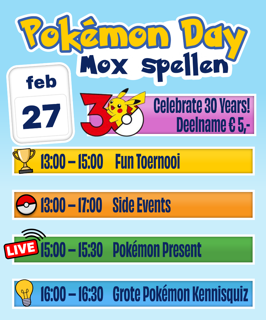 Op vrijdag 27 februari en zaterdag 28 februari vieren we bij Mox spellen de officiële verjaardag van Pokémon, de dag waarop Pokémon voor het eerst op de markt verscheen. Dat doen we natuurlijk met een groot feest voor alle Pokémon-fans!