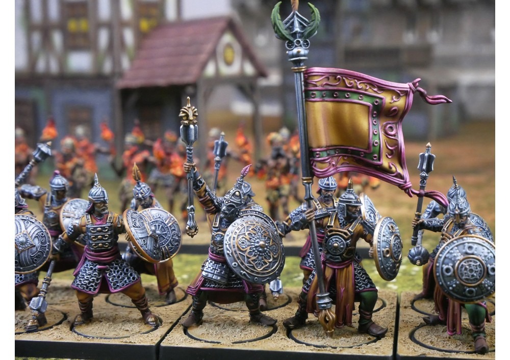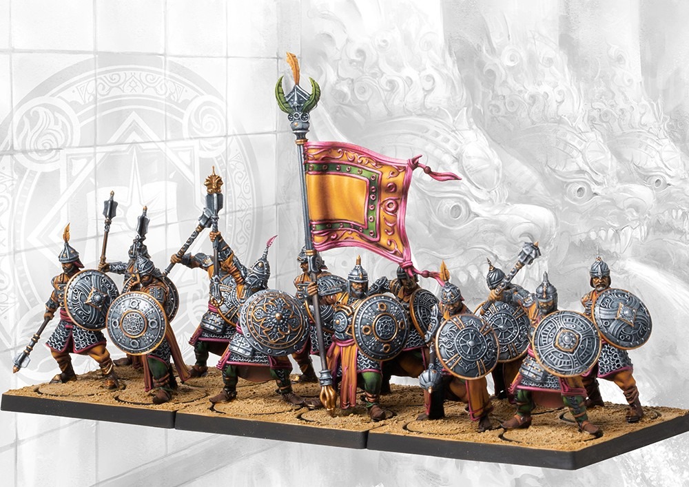 Well equipped, thoroughly trained and highly motivated, the Rajakur infantry are the backbone of the Enclaves’ military might. Clad from head to toe in heavy chain, bearing finely crafted shields and maces, the Rajakur infantry can be trusted to hold their ground against all comers. Their loyalty and professionalism are heavily rewarded, allowing veterans of two enlistments to move on to a wealthy landowning retirement, a privilege reserved only for those who have served in the army.