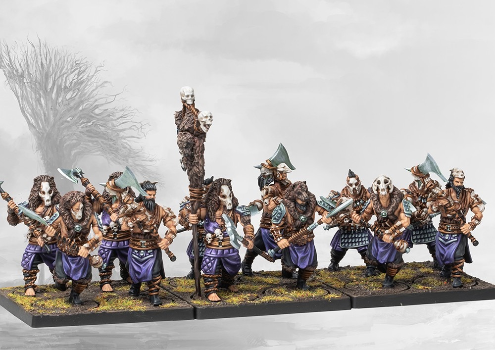 Born of the ancient hunting lodges of the Nords, the Bearsarks have long been a terror on and off the battlefield. Their insular nature, occult practices and unbridled ferocity have made them dangerous to both ally and foe as most Bearsark lodges make ends meet as brigands and raiders among the Nord lands when not directly employed by an enterprising Jarl or Shaman. On the battlefield, their unbridled ferocity, disregard for danger and brutal strength make them ideal frontline combatants, where their vicious two handed weapons make a mockery of whatever defensive formations the foe might hide behind.