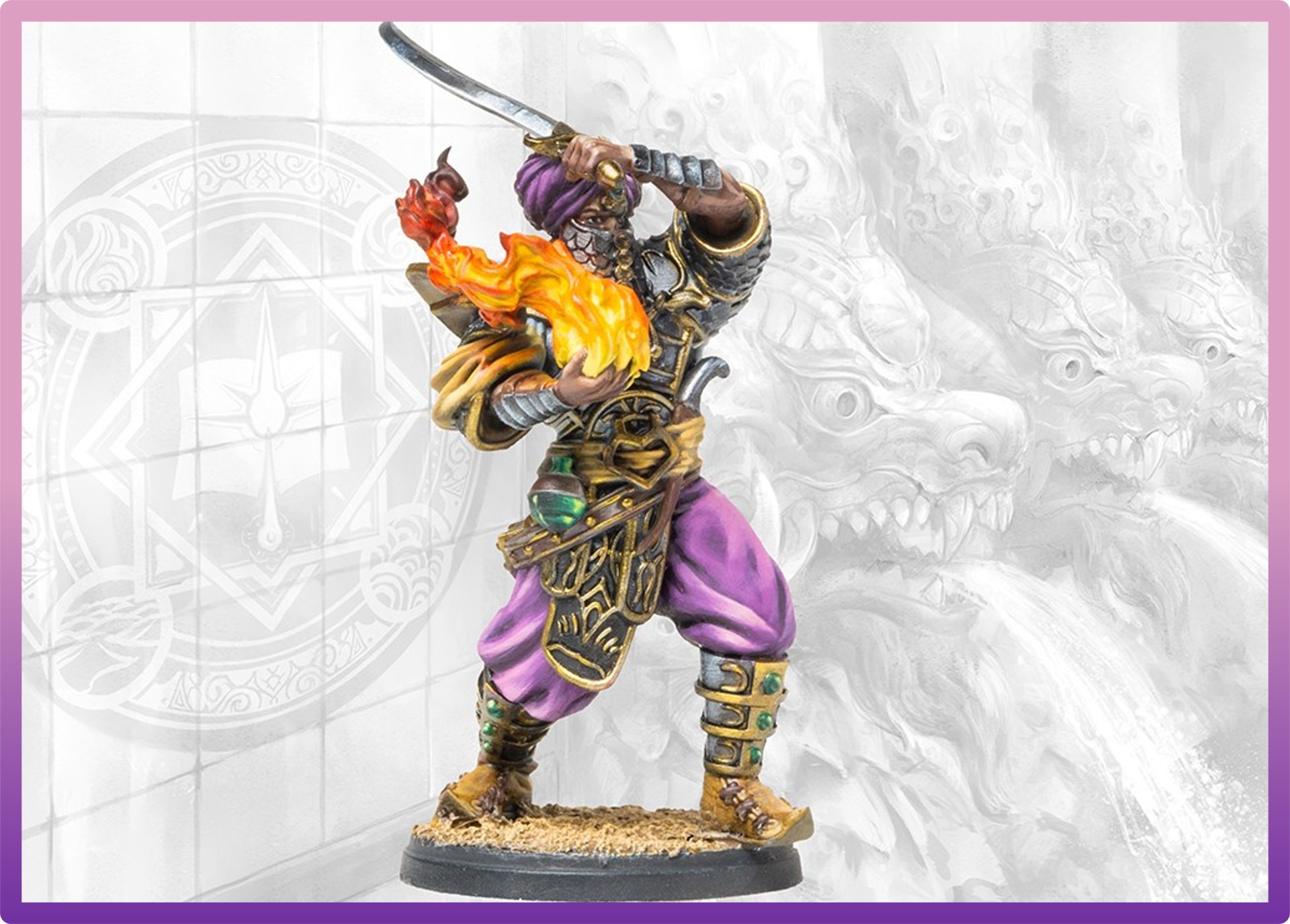 The Raj is a capable warrior and a skilled Spellcaster. Like all Sorcerer Kings' Characters the Raj is able to choose between spells from the court of Air or Fire which will in turn provide Mainstay Regiments of that Element. Like all Character Stands in the Army, Rajs have access to Spells and Rituals unique to them putting heavy emphasis on aggressive play and tactical positioning. The Raj is a perfect fit for the Player who is looking to combine the professionalism and resolve of mortal human Regiments with the aggression and might of the Elementals.