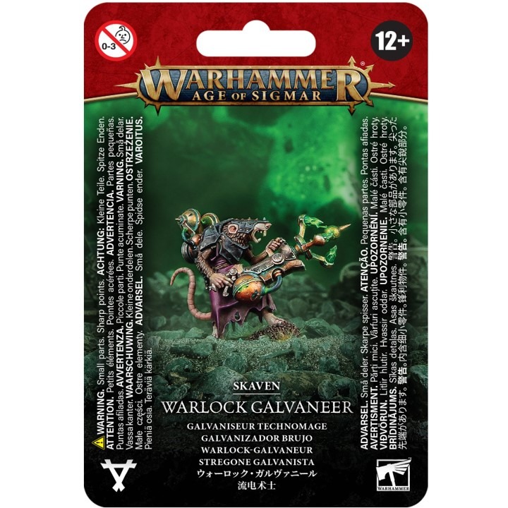 This multipart plastic kit builds a Warlock Galvaneer of the Clans Skryre, a support hero wielding a warpvolt obliterator. These diabolical creatures are incredibly deadly, able to blast apart enemies of the Horned Rat from a distance.