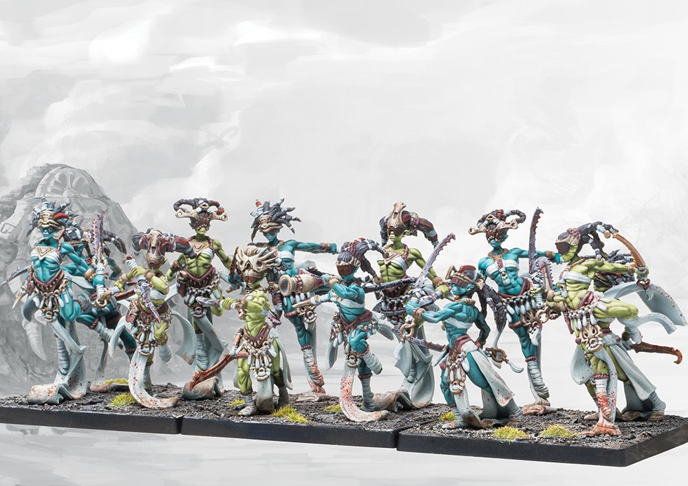 There are few warriors on any battlefield as terrifying as the chosen priestesses of Death. The deep meditative state they are capable of achieving allows them to elevate their hearing to truly superhuman levels, allowing them to "see" through sound giving them a preternatural advantage on the battlefield. They flow onto the battlefield with a deadly grace, their blindfolded forms weaving and covering one another in perfect synchronicity, the entire regiment fighting as a single organism. Entrusted by the tribes as midwives and healers, their medical training makes them deadly foes on the battlefield, their every blow precisely placed to cause the greatest harm possible, severing tendons, rupturing arteries and locking joints with pinpoint precision as they dance away from their foes' clumsy blows.