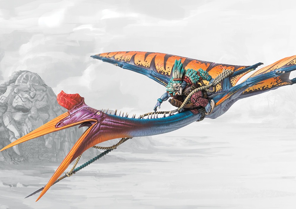 Soaring on thermals above the oases in the Wastelands, the Quatl captured the imagination of W'adrhun from the very beginning. Unfortunately, the process of bonding and domesticating one of these terrifying beasts is an arduous one that begins as soon as the beast is hatched, as it imprints on the first living being it identifies as its "mother". Countless Braves found an unfortunate end seeking to tame adolescent Quatls only to be torn limb from limb by their enraged parents or the beast itself. Once the secret of imprinting was discovered, the number of Quatl riders has steadily risen, but difficulty in acquiring a healthy Quatl egg has stymied their growth. Loath to risk these rare resources in combat, enterprising riders have learnt to use the beast's speed to maximum effect, soaring through the battlefield at breakneck speeds then spearing their hapless foe with their custom harpoons. Those that are not instantly slain by the violent impact are invariably slain by the sudden pull, even larger beasts risk being mangled or even slain by a well placed harpoon.