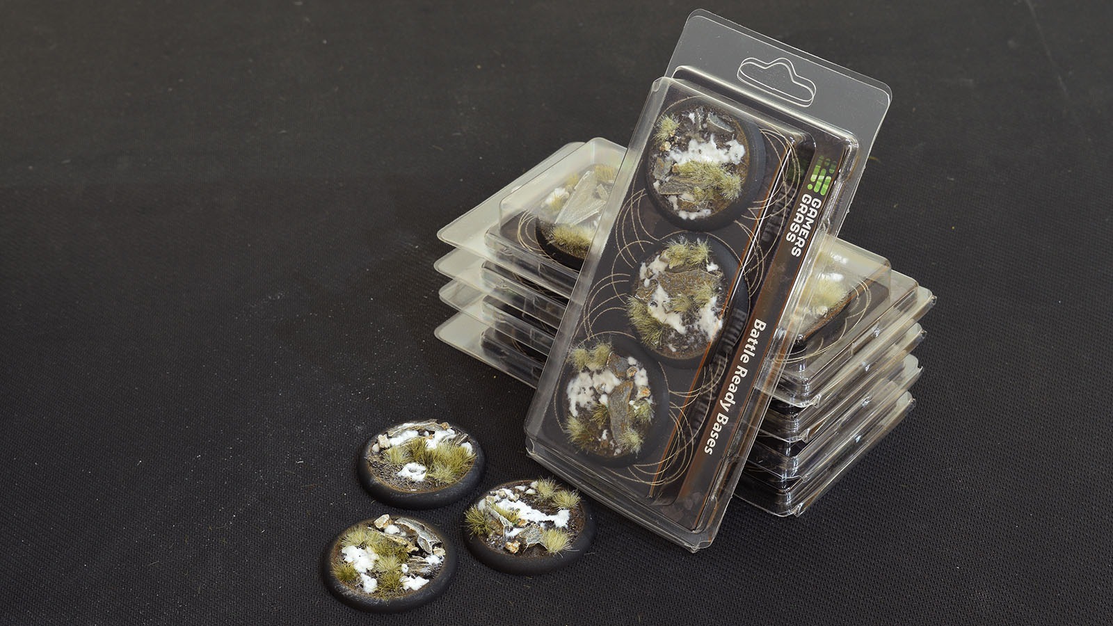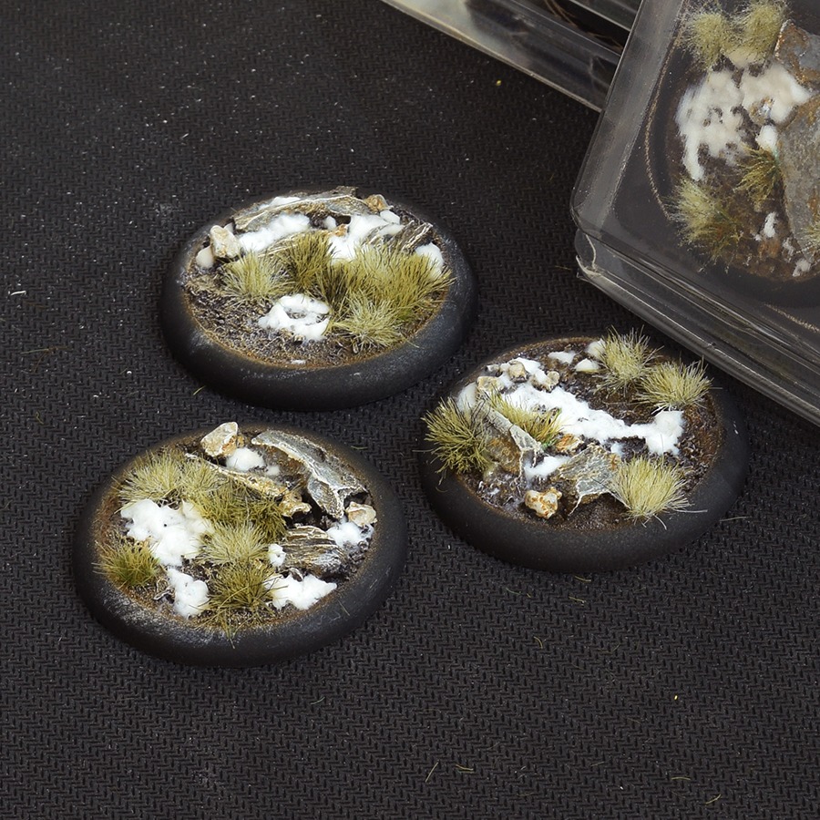 This pack contains 3 round Battle Ready Bases 50mm wide in a winter theme.