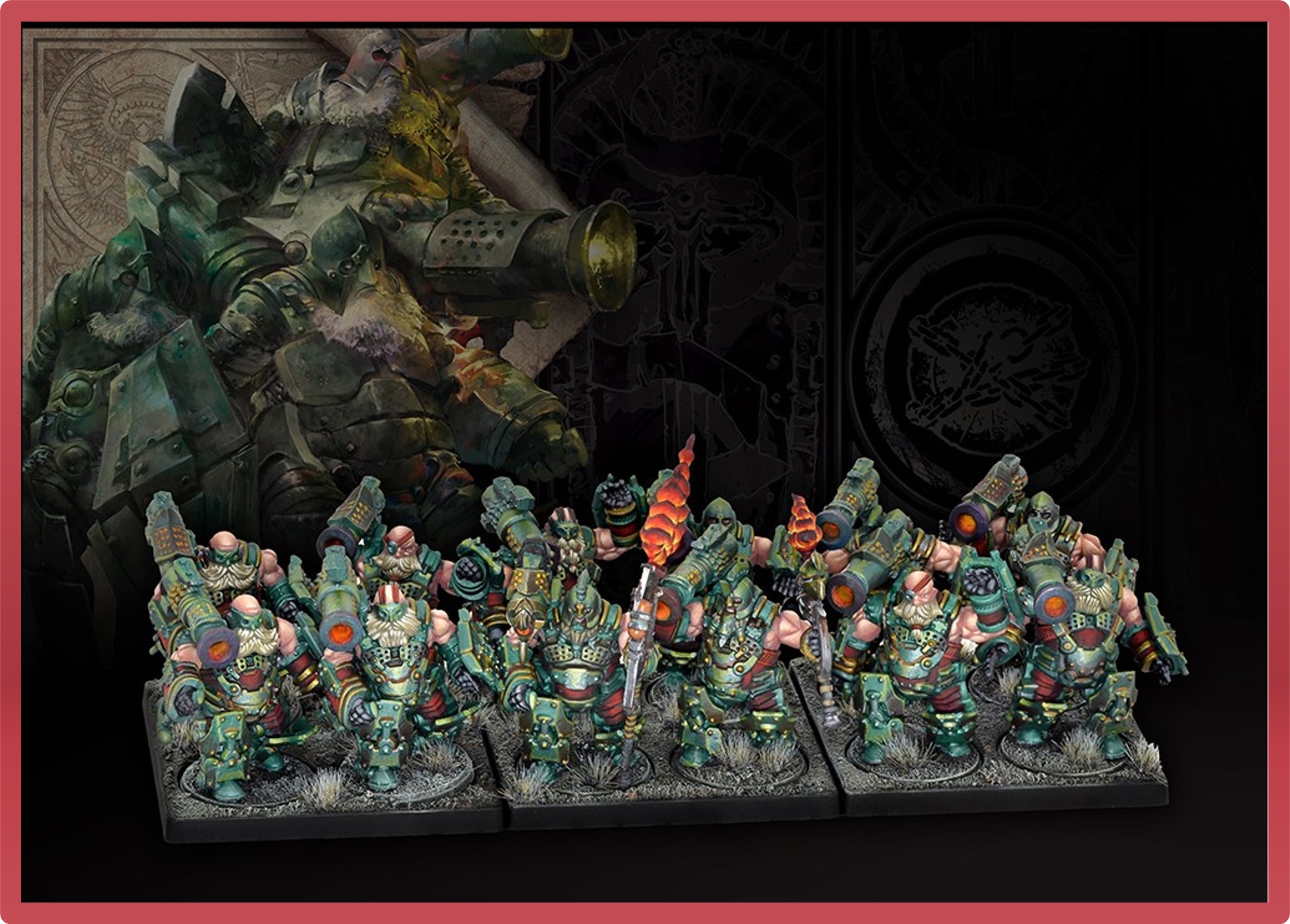 Unlike their Stoneforged brethren, the exoskeleton of the Fireforged is focused simply on the delivery and containment of their main armament: the Blast Cannon. Based on a scaled down design of the Hellbringer Cannons used to hunt the greatest of dragons, the Blast Cannons draw and shape the uncontrolled gift of their Dweghom users to generate powerful directional blasts of superheated flame capable of puncturing even the heaviest of plate at a hundred paces. Their powered exoskeletons enhance their strength, allowing the Fireforged to remain mobile on the field of battle despite the weight of the Blast Cannon to deliver their powerful blasts where most needed. More than capable in close combat, the Fireforged can then follow up a devastating salvo with a savage charge, or easily fend off light units and skirmishers, allowing their heavy weaponry to be employed at bringing down the most heavily armored of foes.