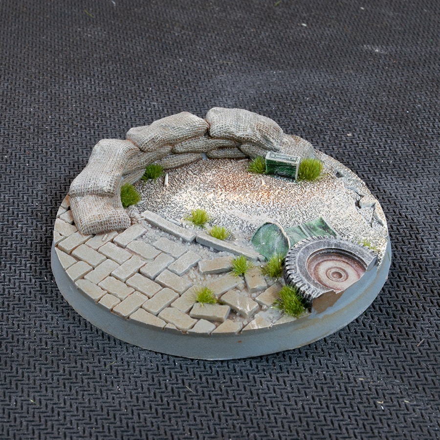 Dusty streets with broken asphalt, loose sidewalk bricks, abandoned wheels, sandbags, trenches, fuel drums and debris overrun by small herbs and mosses. These bases are perfect for all urban war backgrounds, from the Great Wars to sci-fi future conflicts.