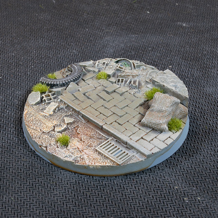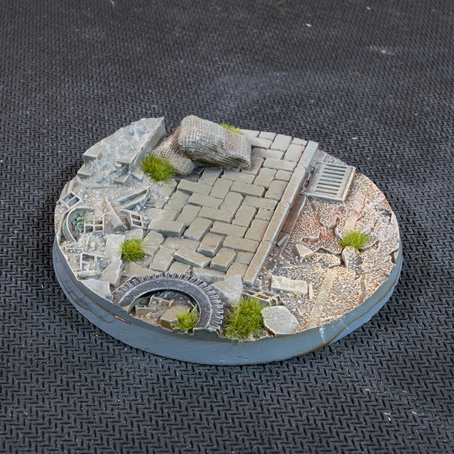This pack contains 2 round Battle Ready Bases 50mm wide in an urban warfare theme.