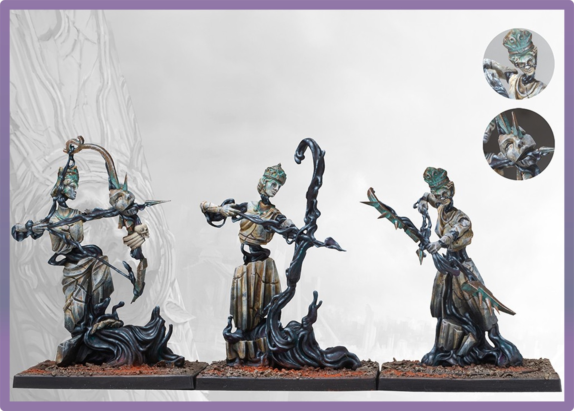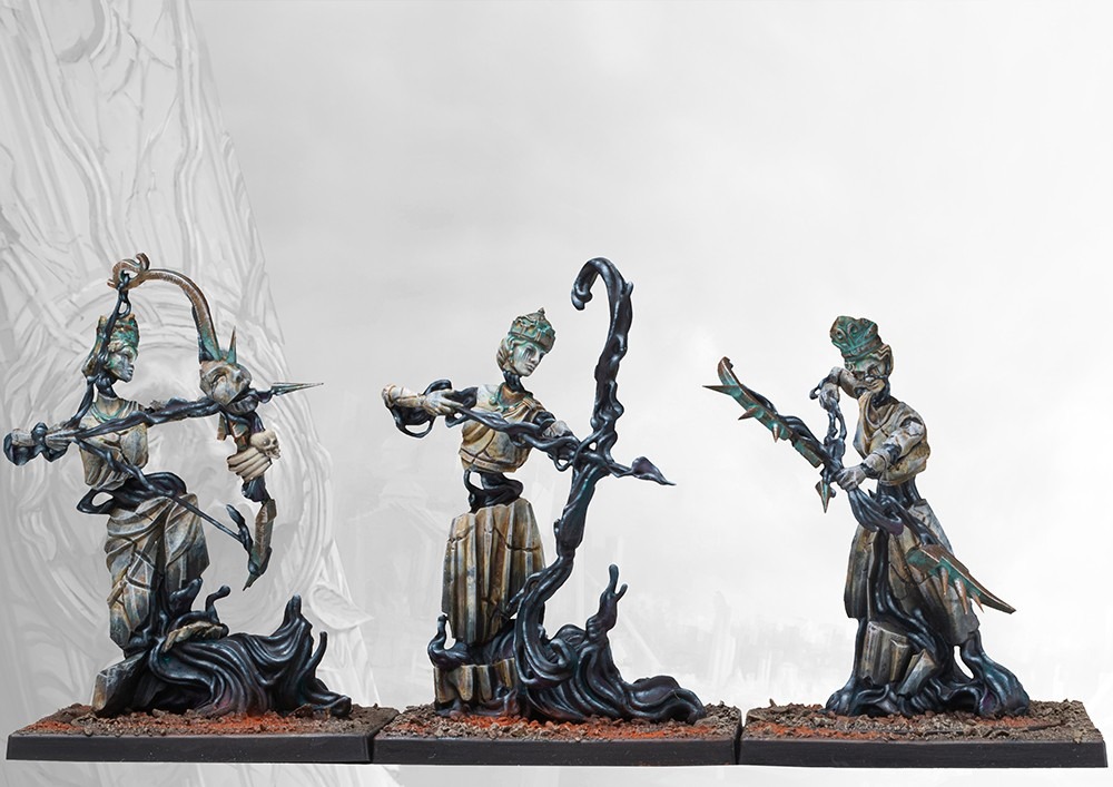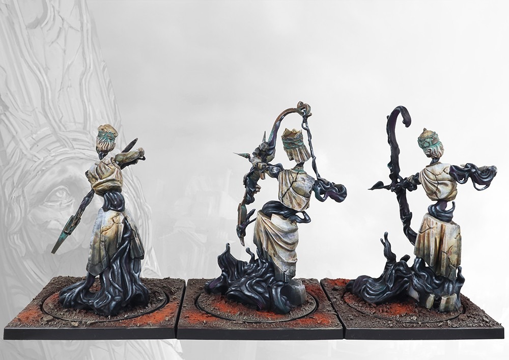 While Hazlia’s Fall and subsequent annihilation of the population of Capitas infused the very stones of Capitas with his power, nowhere was this more evident than in his greatest temples. Here the very blood of Hazlia oozed from the walls, infusing his holiest icons and statuary with a dark parody of life. The beautiful Karyatids that once ringed the great temple’s temenoi have come to life and, in a grotesque parody of their ritual purpose, now hunt down all interlopers in their god’s domain. Only the most zealous and dedicated of Hazlia’s servants can hope to bind these unholy creations in common purpose to unleash their horror upon the battlefield, where missiles creatide of divine blood and sheer spite make a mockery of mortal armor and flesh.