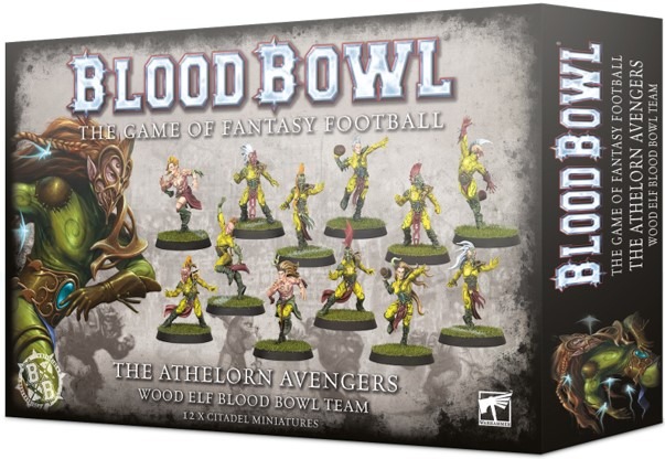 This multipart plastic kit contains all the components you need to assemble the Athelorn Avengers, a Wood Elf team for use in games of Blood Bowl, containing 2 Catchers, 2 Throwers, 2 Wardancers and 6 Line Elves, plus a roster sheet. Also included are a transfer sheet, 2 turn markers featuring a Wood Elf motif, 3 thematic balls, and 14 Citadel 32mm Round bases featuring holes in which to place the ball.