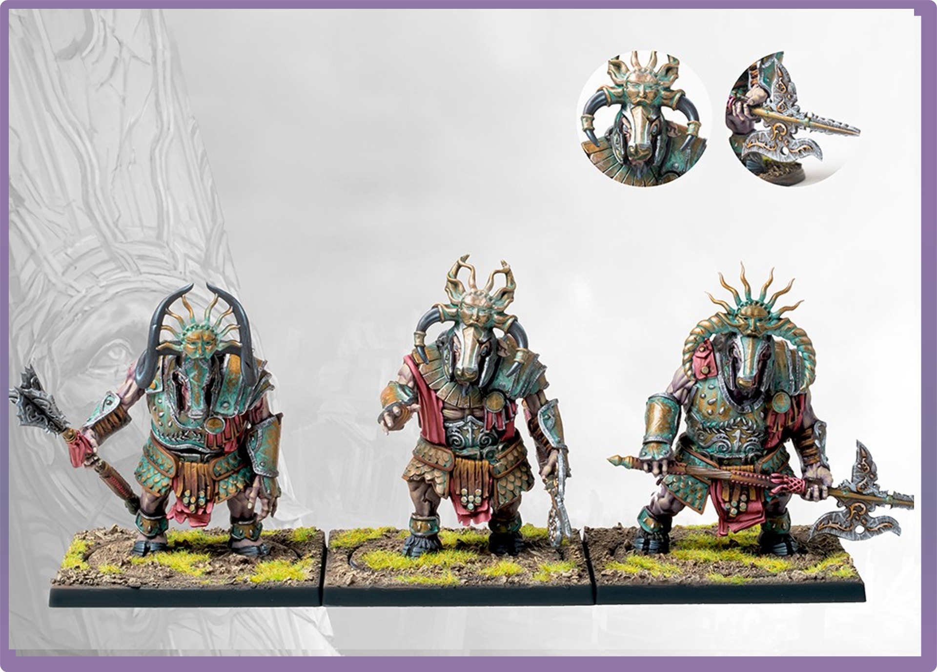 The Buccephaloi of the Old Dominion were the sacred guardians of it’s holiest sites. Clad in beautiful ceremonial panoplies, these simple and devout guardians were selected from amongst the most powerful of Minotaur Thyreans, their horns ritually cut off in an act of devotion and subservience to Hazlia. Such was the power and majesty of the Buccephaloi that only in death were they called to battle, while alive none dared oppose them.