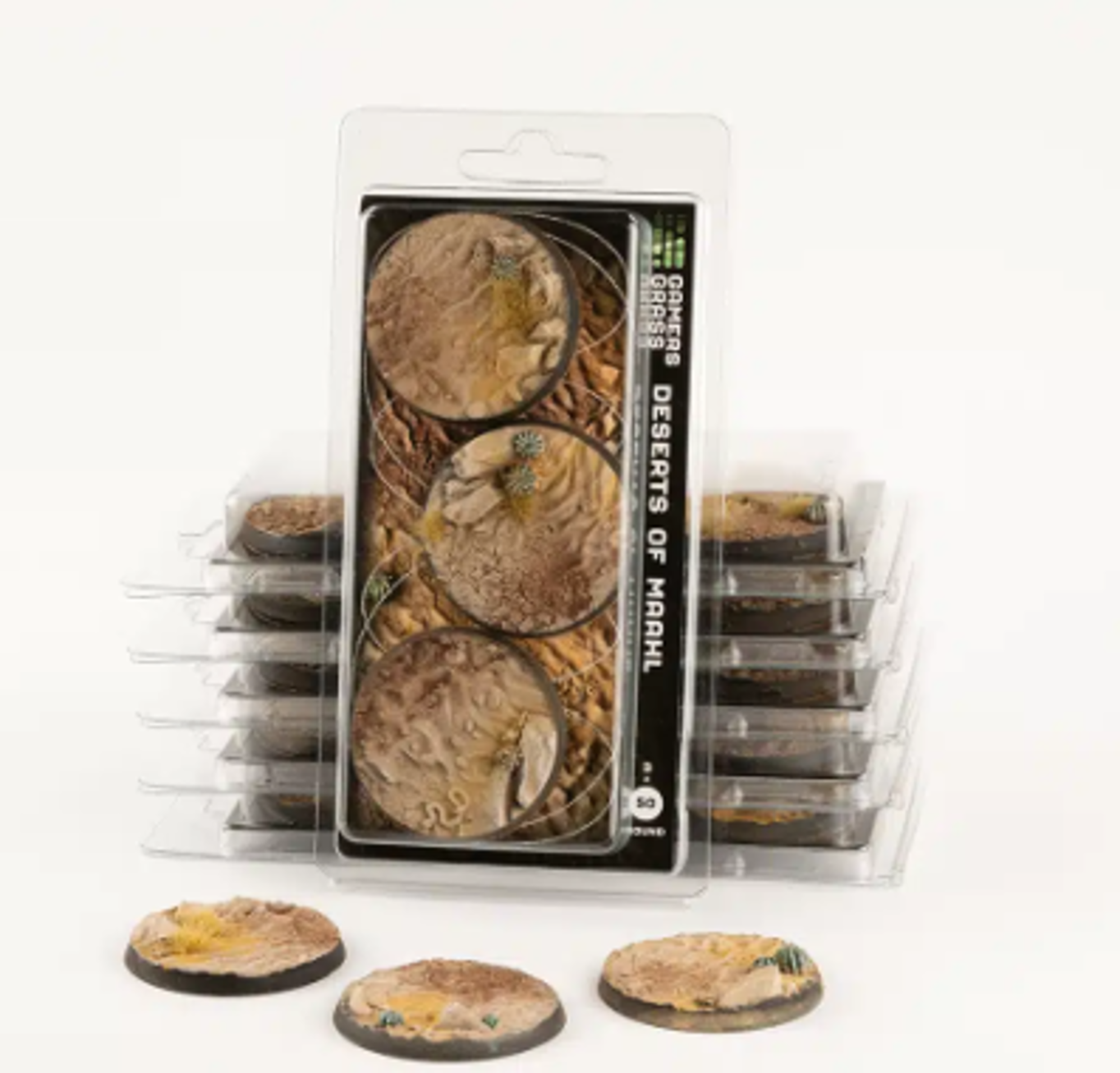 This blister contains 3 thermoplastic 50mm wide round Battle Ready Bases, in a Deserts of Maahl theme.