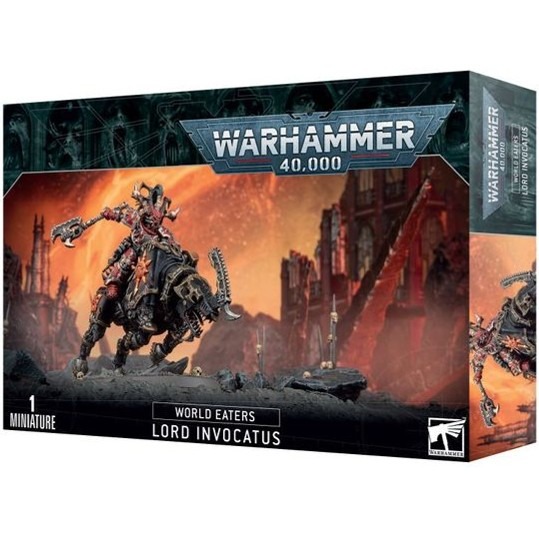 This multipart plastic kit builds Lord Invocatus – a legendary warlord of the World Eaters Legion. This mysterious figure is mounted atop his mighty juggernaut Khal'guruth, Steed of the Burning Sky, and wields a pair of signature weapons – a bolt pistol called Trickster's Doom, kept holstered at his waist, and a peerless chainaxe dubbed Coward's Bane. His ornate armour bears all the signs of Khorne's hellish favour – from the sigils of Chaos to his biomechanical daemonic helm.