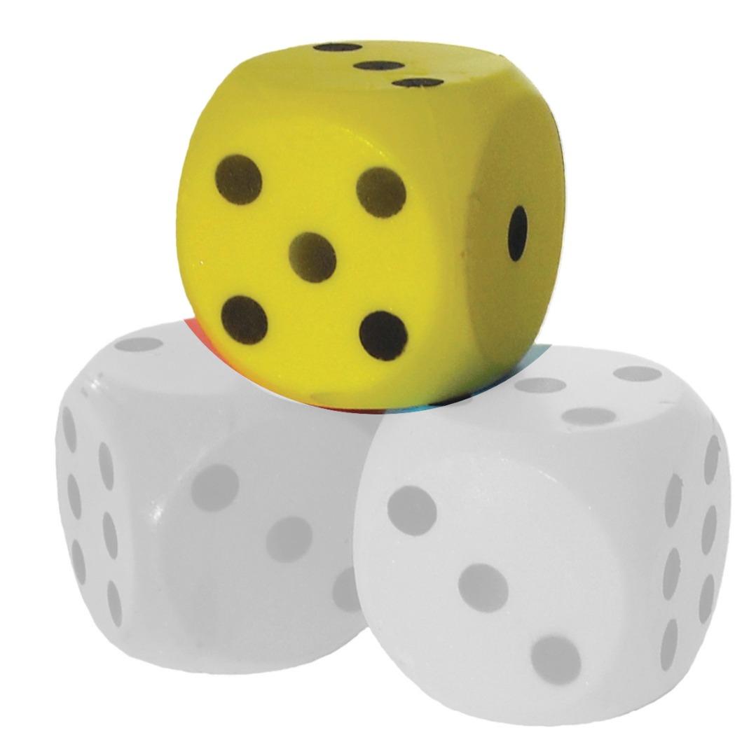 Grote dobbelsteen van schuimrubber, 15 cm.Geel met zwarte stippen.Per stuk verpakt in plastic zak.
