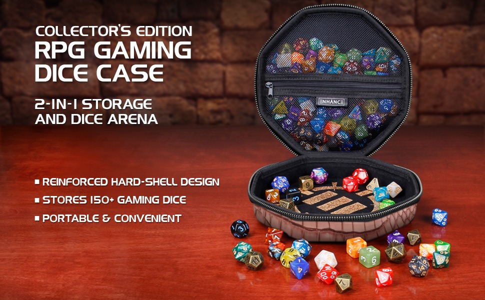 ENHANCE Tabletop Collector's Edition Dice Case. Upgraded with the power of Dragon Scales, along with a collectible metal charm keychain and holographic sticker to mark the exclusivity of your Collector's Edition Dice Case. Beautifully designed with stylish metal accents, the ENHANCE Dice Case is the perfect addition to your collection of RPG accessories. The dice case is two products in one, with one half safely storing 150 dice and the other functioning as a tray to be passed around the table or held onto for personal use. Our reinforced case protects your dice from wear and tear, while the soft lined interior keeps all your dice free from unsightly scratches.