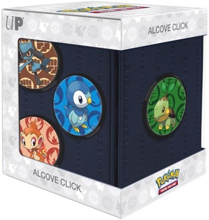 Collect, store, and personalize with the Alcove Click for Pokémon! The Alcove Click comes with four themed badges featuring Turtwig, Chimchar, Piplup and Riolu. This Deck Box holds up to 100 standard size trading cards double-sleeved in Ultra PRO Deck Protector® sleeves, features a strong magnetic closure, and has dual thumb notches for easy access to your deck. Personalize your Alcove Click by popping on your favorite magnetic badges and replacing them with other badges. badges have a 1.5 in. diameter.