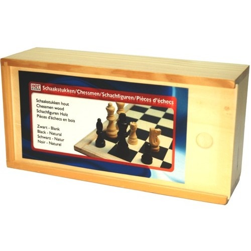 Schaakstukken hout, blank / zwart. Koningshoogte 77 mm. Deze schaakstukken hebben een staunton maat 3. Verpakt per set in blank houten kist met schuifdeksel.