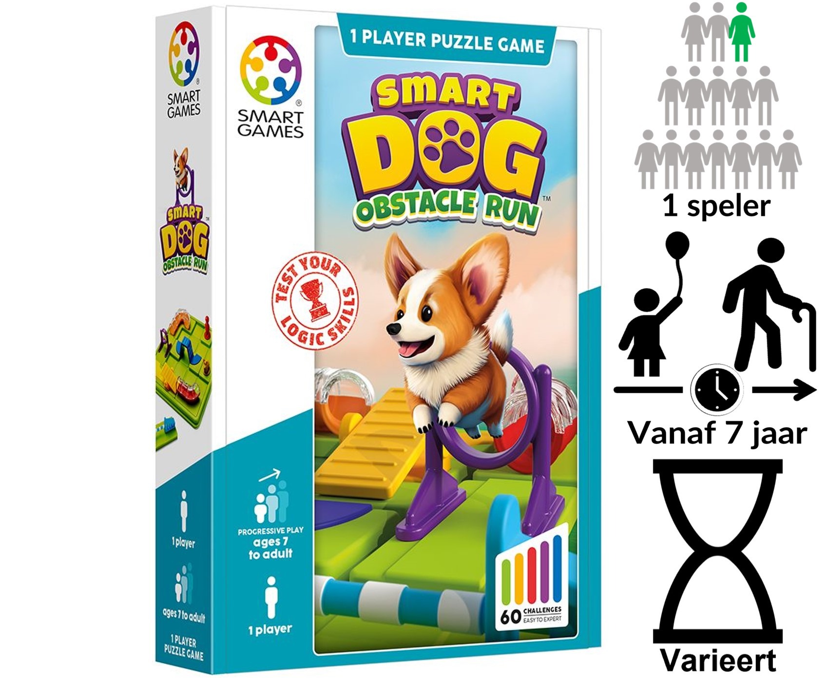 Compact spelbord met transparant deksel, 1 hondentrainer, 1 hond, 6 puzzelstukken met hindernissen, opdrachtenboekje met 60 opdrachten en oplossingen.