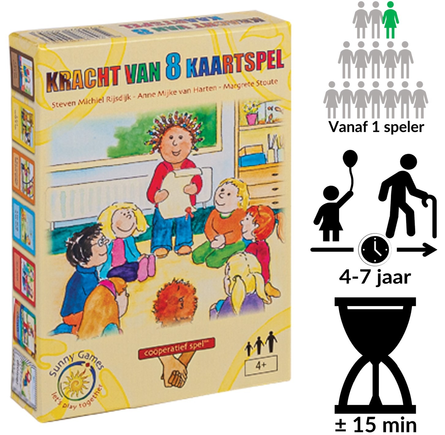 Het Kracht van 8 kaartspel is thuis, op de basisschool en bij individuele begeleiding van kinderen te gebruiken. Het kaartspel draagt bij aan een positieve manier van met elkaar omgaan. Alle spellen kunnen met een groepje kinderen gespeeld worden; een deel ook met z’n tweeën of zelfs alleen. Een krachtkaart trekken kan ook: de kaart dient dan als steuntje in de rug of als speels begin van een gesprek.