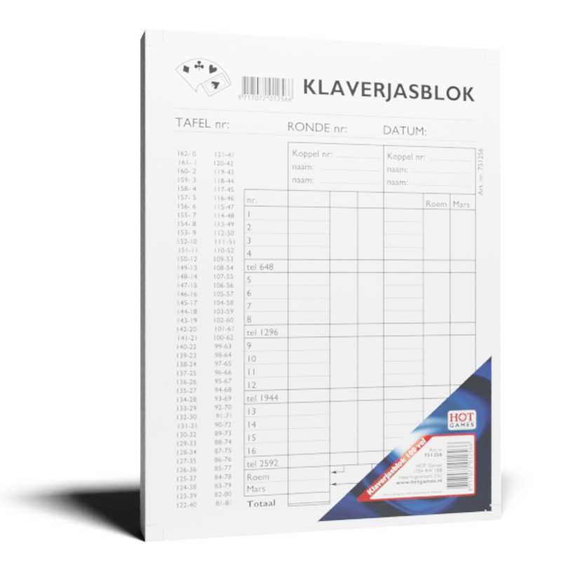 Klaverjas score bloc, Nederlands. Met 100 vellen per bloc. Afmetingen 21 x 15 cm, A5. A-kwaliteit 80 grams papier. Met kartonnen rug, zodat het goed noteren is tot het laatste vel.