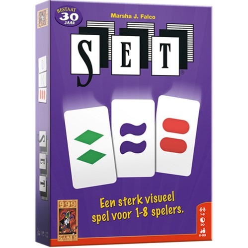 Zenuwslopend reactiespel voor het hele gezin. Zoek drie kaarten waarvan de eigenschappen helemaal verschillend of volledig gelijk zijn. Wie roept het vaakst "SET!" ?