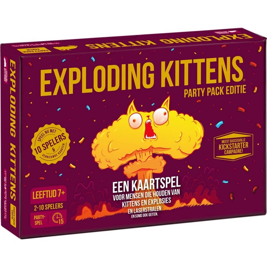 Deze Exploding Kittens Party Pack is een versie van het populaire kaartspel Exploding Kittens en is geschikt voor maximaal 10 spelers. Dit spel bevat een selectie van kaarten uit het basisspel, kaarten uit de uitbreiding Imploding Kittens en uit de Exploding Kittens App. De box is voorzien van een feestelijk deuntje, dus het is ideaal voor tijdens een feestje!