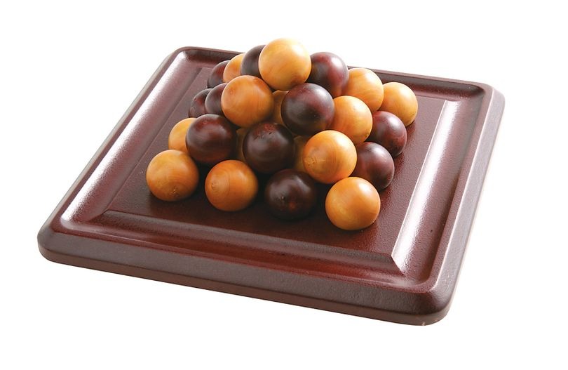 Een abstract, tactisch spel voor 2 spelers. Leg steeds 1 bal in een blok van 4 bij 4. Liggen er vier ballen naast elkaar in een vierkant, dan mag er een bal op. Wie de laatste bal in de piramide legt, wint het spel. Met spelregels voor kinderen en gevorderden.