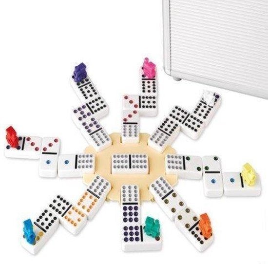 Met 91 stenen. Dubbel 12 domino verpakt in aluminium koffer met handvat. Compleet met 9 treintjes en station. Steenmaat is 50 mm x 25mm x 9.5 mm met gekleurde punten. Afmeting koffer 20.5 x 20.5 x 9 Cm Het meest gespeelde familiespel in Canada. Spelregels in Nederlands