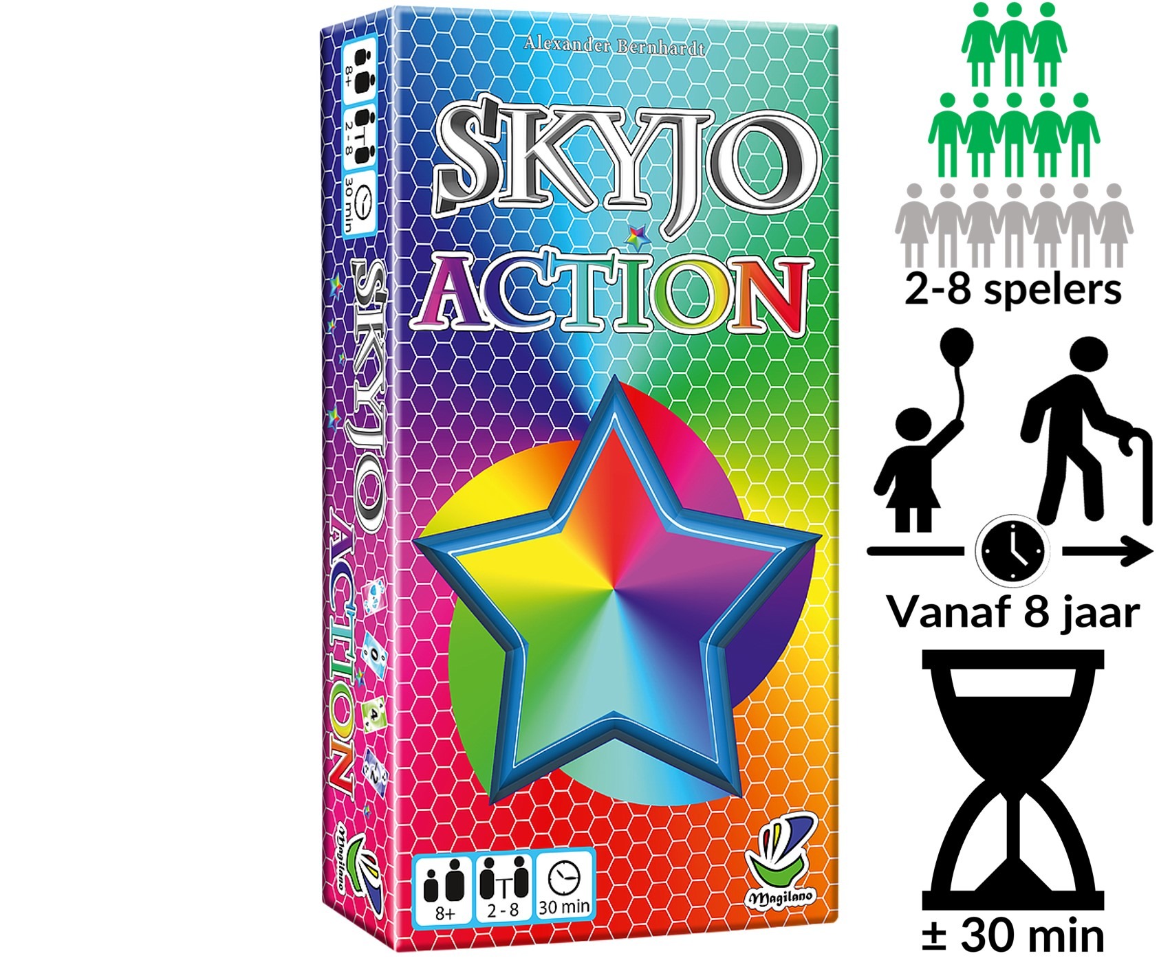 Skyjo Action voegt (zoals de naam al doet vermoeden) actiekaarten toe, die speciale bewegingen mogelijk maken: kaarten uitwisselen in je tafel, kaarten uitwisselen tussen spelers, een actiekaart stelen, twee beurten achter elkaar nemen enz. Je krijgt een actiekaart wanneer je hem plaatst of onthul een Joker in je tableau, of je kunt een Actiekaart nemen in plaats van een normale zet. Jokers zorgen voor een eenvoudigere verzameling van sets en maken op zichzelf zeer waardevolle sets (-10 of -15 punten).