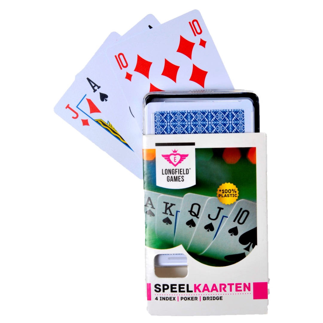 Speelkaarten 100% kunststof enkel. Met 4 indices, enkel deck in blauw of rood. Afmeting kaarten: 89 x 58 mm. bridgemaat. Met internationale pop / afbeelding.