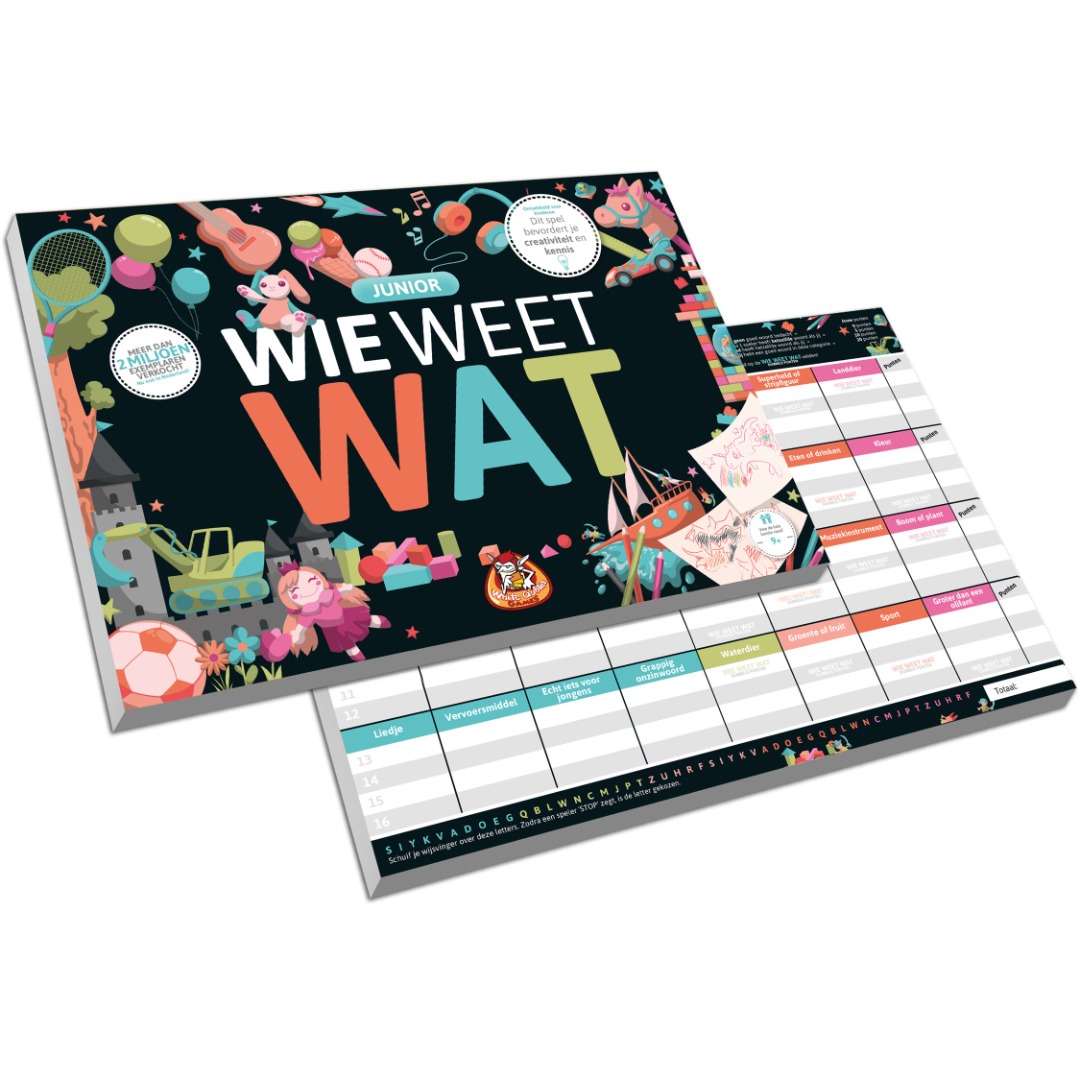 Naast Wie Weet Wat Standaard en Wie Weet Wat Kerst, speel je nu ook Wie Weet Wat Junior. Deze variant is er voor de hele familie vanaf 9 jaar. Met leuke nieuwe categorieën zoals ‘in de koelkast’, ‘kleiner dan een voetbal’ en ‘op school’, kunnen zelfs de jongere fans van Wie Weet Wat en woordspellen gemakkelijk meespelen. Bijna iedereen kan nu meedoen!