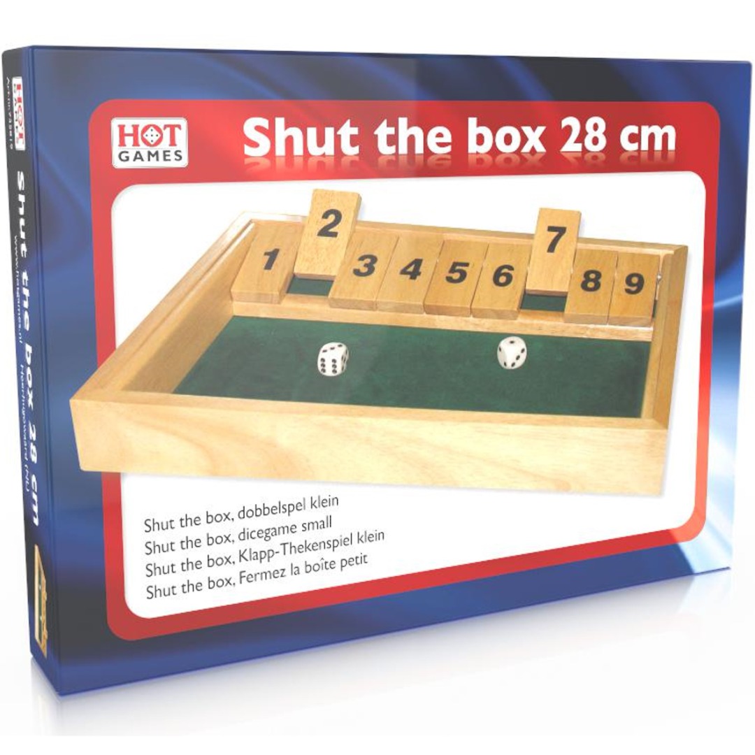 Shut the box, dobbelspel klein. Rubberwood.Houten bak, bekleed met groen vilt.